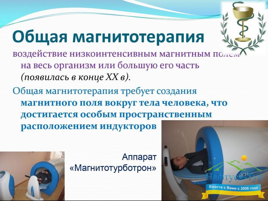 Магнитотерапия – семейство физиотерапевтических методик, которые объединяет то, что при их применении лечебное воздействие на организм пациента осуществляется магнитным полем. В санаториях и медицинских стационарах для проведения лечения по данной методике используют аппаратуру, способную генерировать постоянное и переменное магнитное поле. От вида используемого поля во многом зависит оказываемый на организм пациента эффект и, соответственно, перечень заболеваний, которые поддаются терапии. В любом случае в ходе сеанса магнитотерапии в человеческом организме наводятся вихревые токи, обеспечивающие позитивный эффект на микроуровне – активизацию клеток и реакций в них, улучшение циркуляции крови и лимфы, ускорение процессов регенерации. К перечню заболеваний, при которых предписывают магнитотерапию постоянным или переменным полем относятся артрит, гипертоническая болезнь, остеохондроз, тромбофлебит и многие другие. Также данный вид физиотерапии успешно применяют для снятия воспалительных процессов.