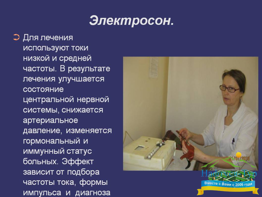 Электросон относится к числу тех физиотерапевтических методик, которые могут применяться в курсах лечения чрезвычайно широкого спектра заболеваний. Так, в санаториях сеансы электросна назначают и людям, имеющим проблемы с артериальным давлением, и пациентам, страдающим от нервных расстройств, болями различной природы. Приведенный список является далеко не исчерпывающим, поскольку во время и после сеанса у пациентов наблюдается нормализация всех или большинства жизненно важных процессов (обмен веществ, кроветворение, пищеварение, оптимизация гормонального фона и так далее), а эти результаты необходимы при терапии любого заболевания. С точки зрения физиологии методика электросна основана на воздействии на пациента слабых разрядов тока, реакцией организма на которые является погружение в состояние, очень близкое к обычному сну.
