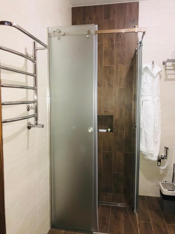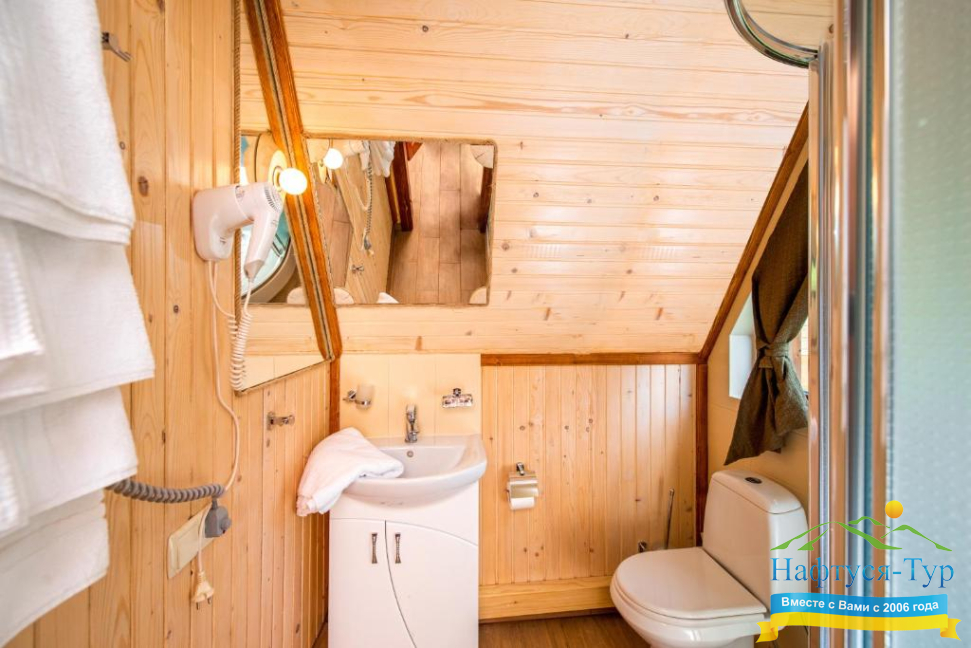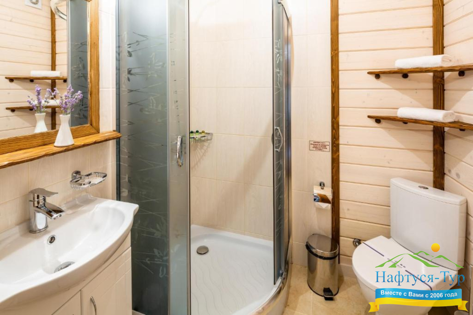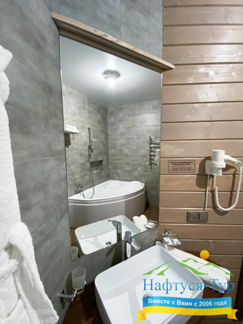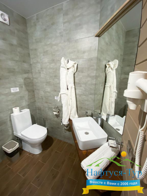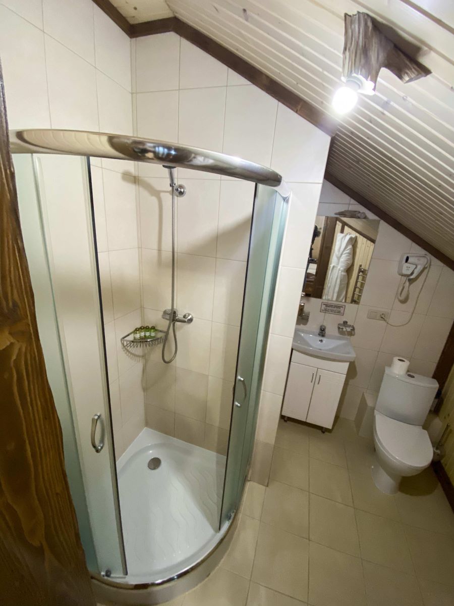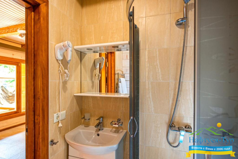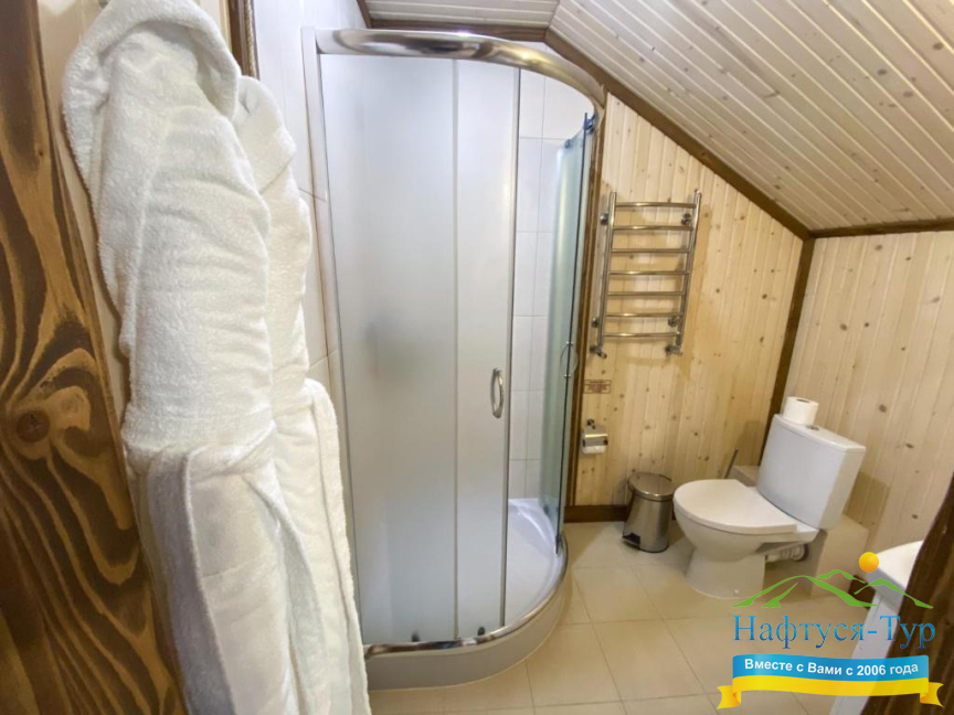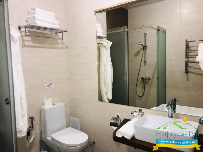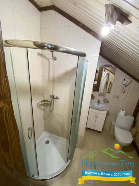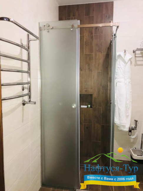 • душевая кабина, фен, халат, косметический набор