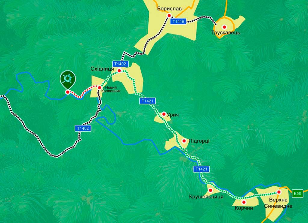 Расположение 5 км до п. Сходница, 20 км до г. Трускавец, 120 км до Львова