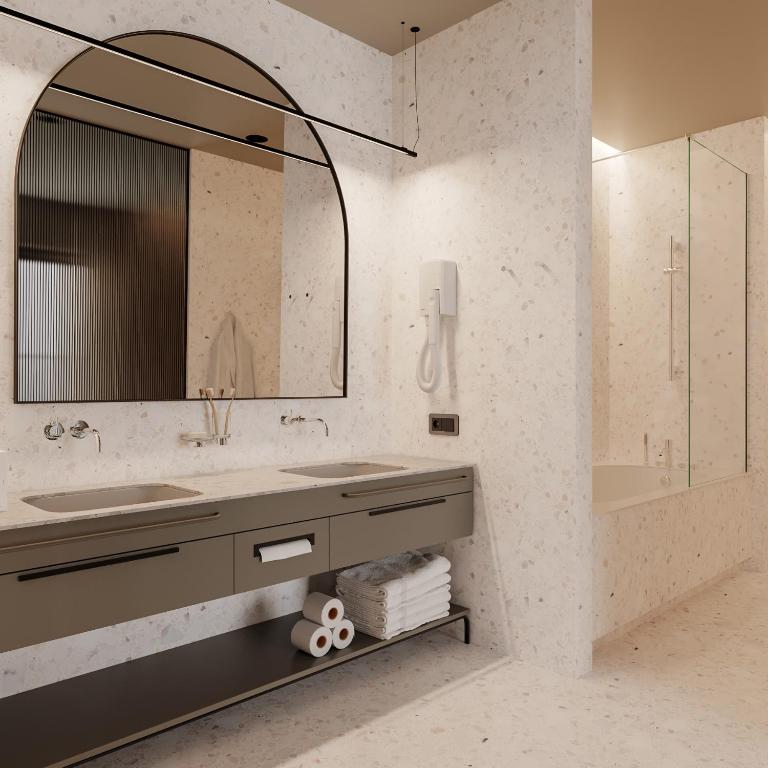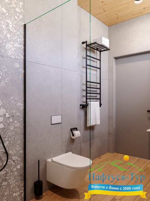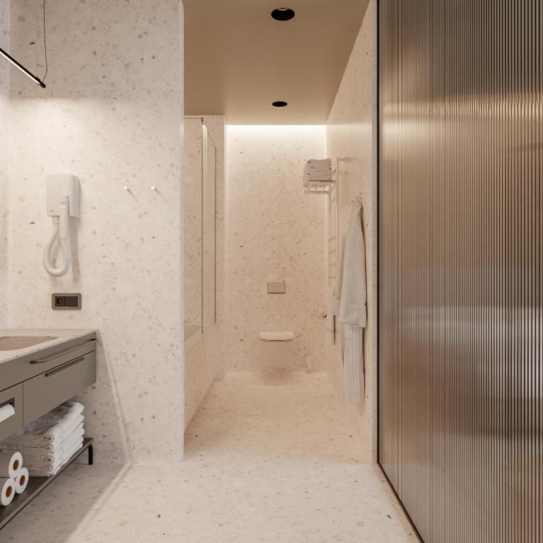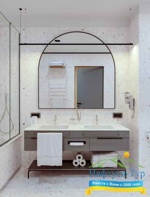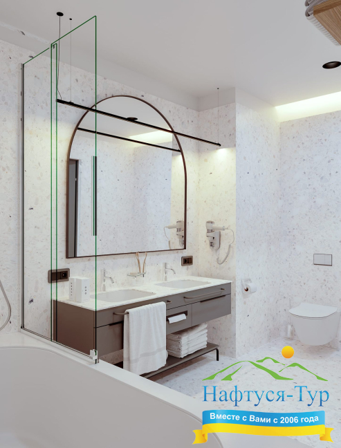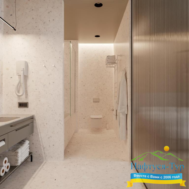 - ванна, душевая кабина, косметический набор, набор полотенец, фен, халат