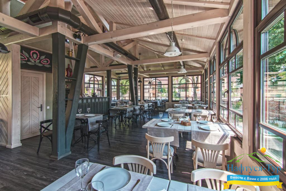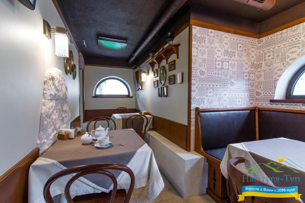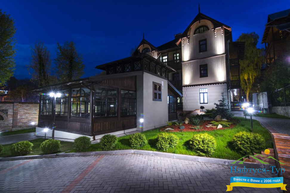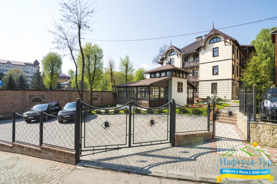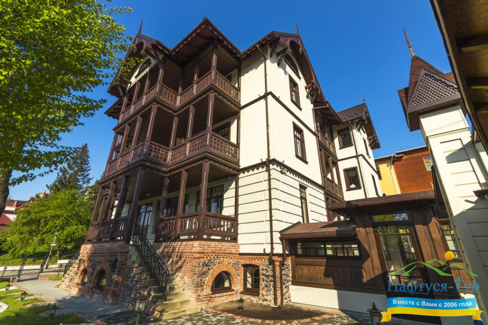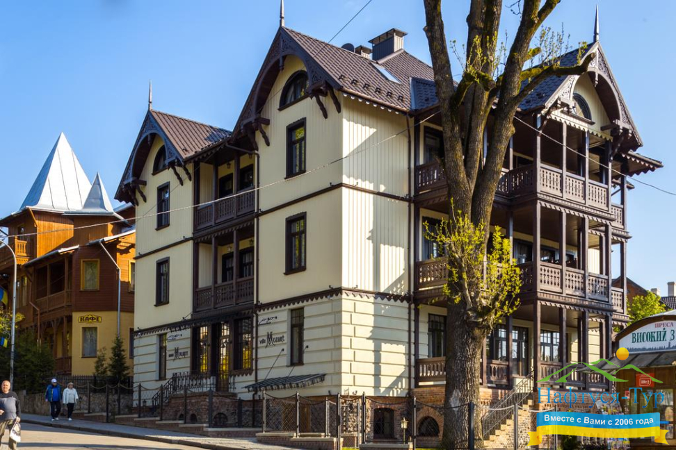· Одно из самых красивых зданий в Трускавце! Резные деревянные балконы, Веранда-Ресторан, лестница, дизайн номеров просто безупречны и достойны восхищения! Здесь царит дух Альпийского предгорья.