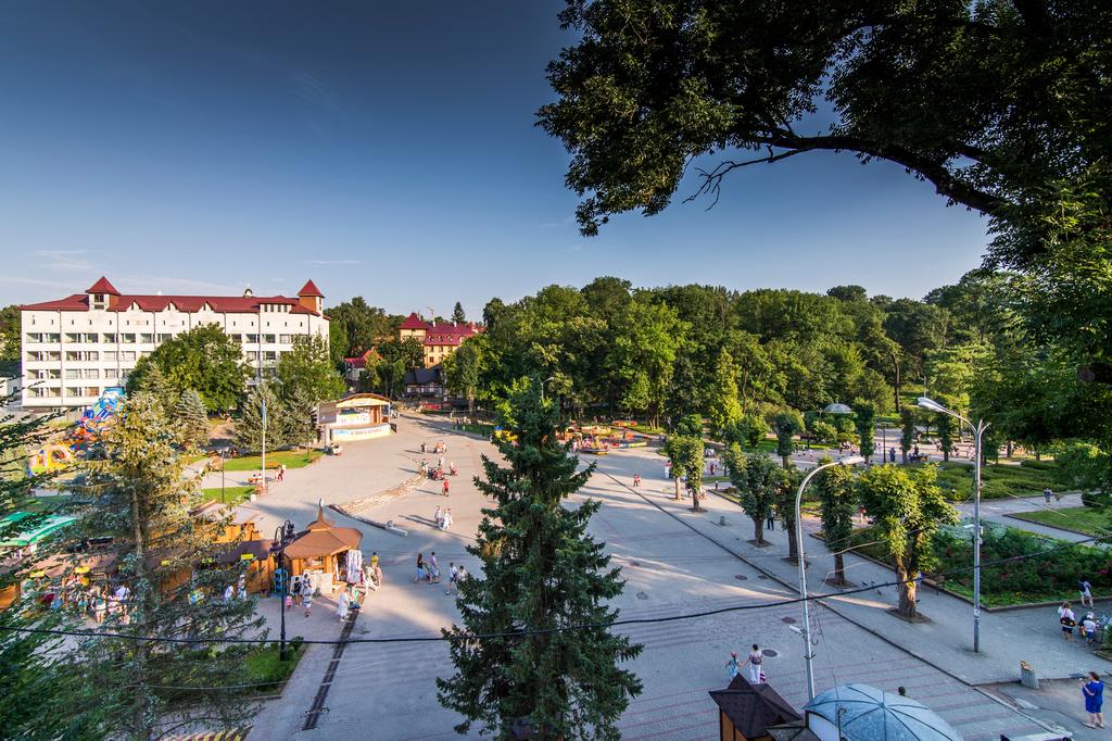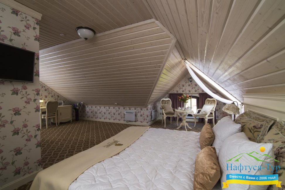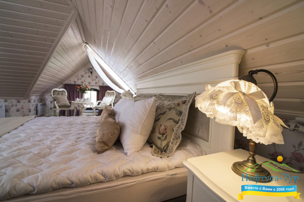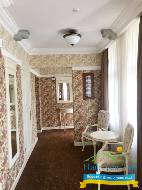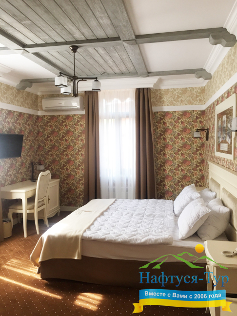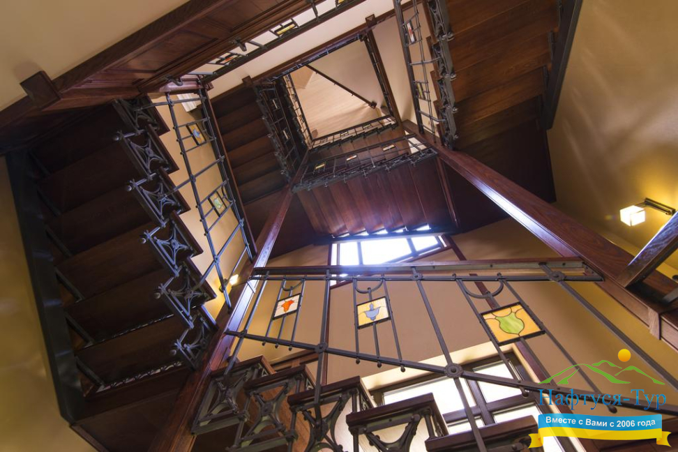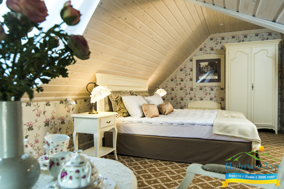 · Одно из самых красивых зданий в Трускавце! Резные деревянные балконы, Веранда-Ресторан, лестница, дизайн номеров просто безупречны и достойны восхищения! Здесь царит дух Альпийского предгорья.