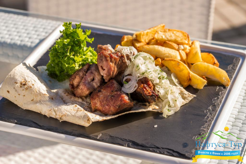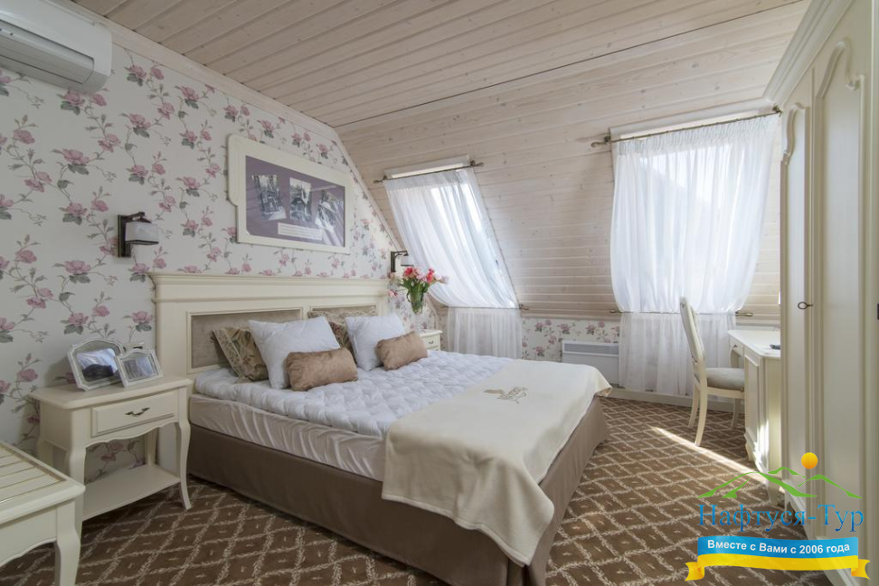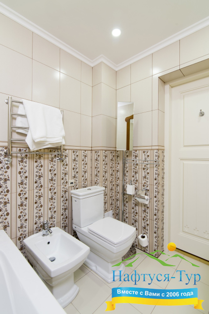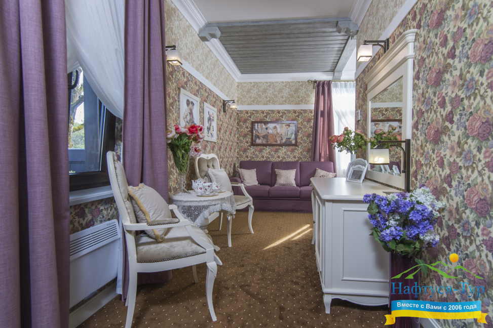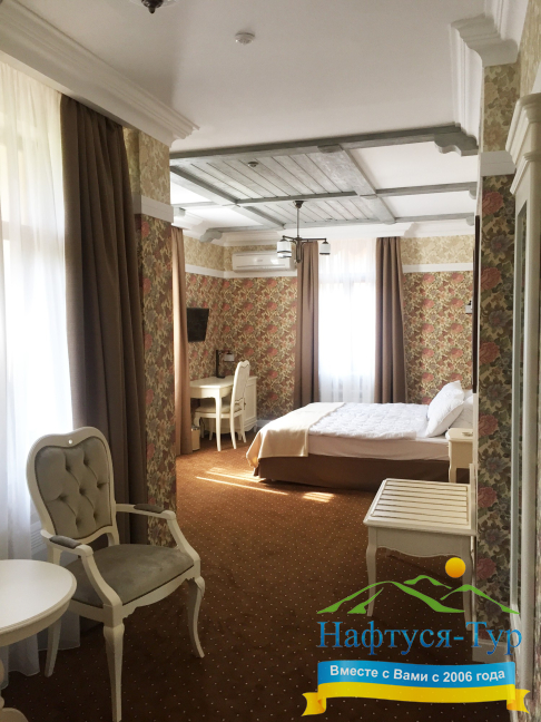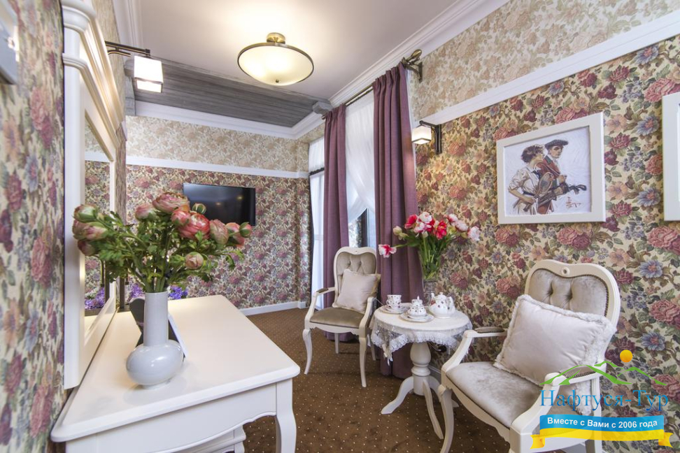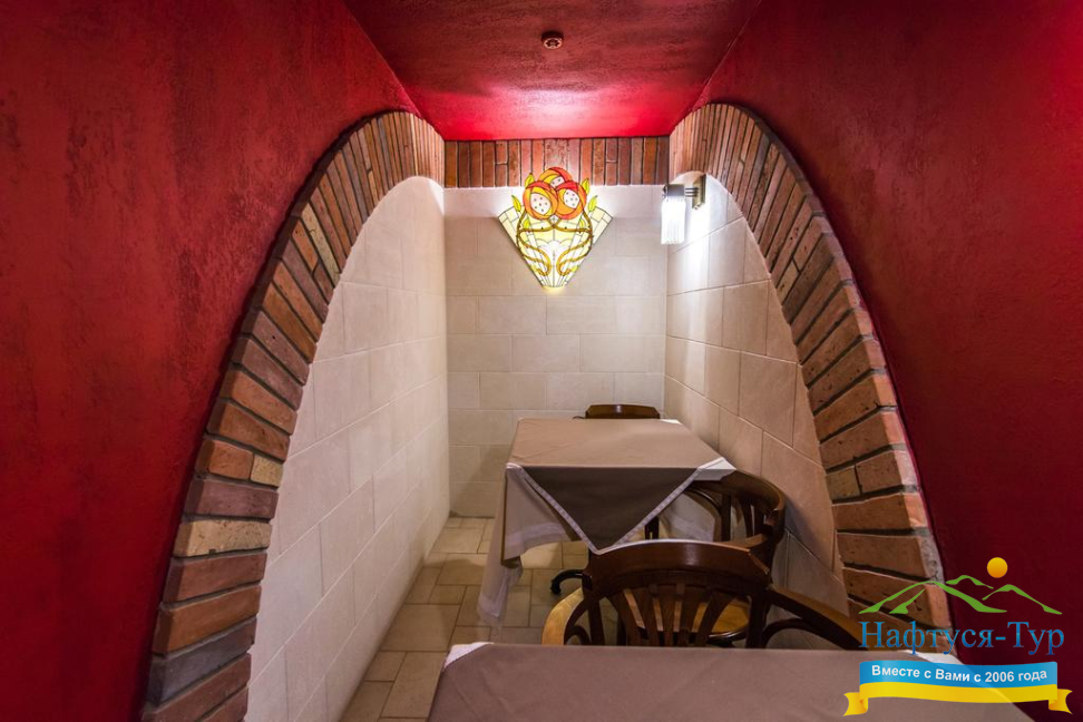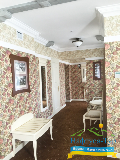 Расположение виллы «Моцарт»: 2 мин. пешком до бювета №1, 10 мин. пешком до офиса «НАФТУСЯ-ТУР»