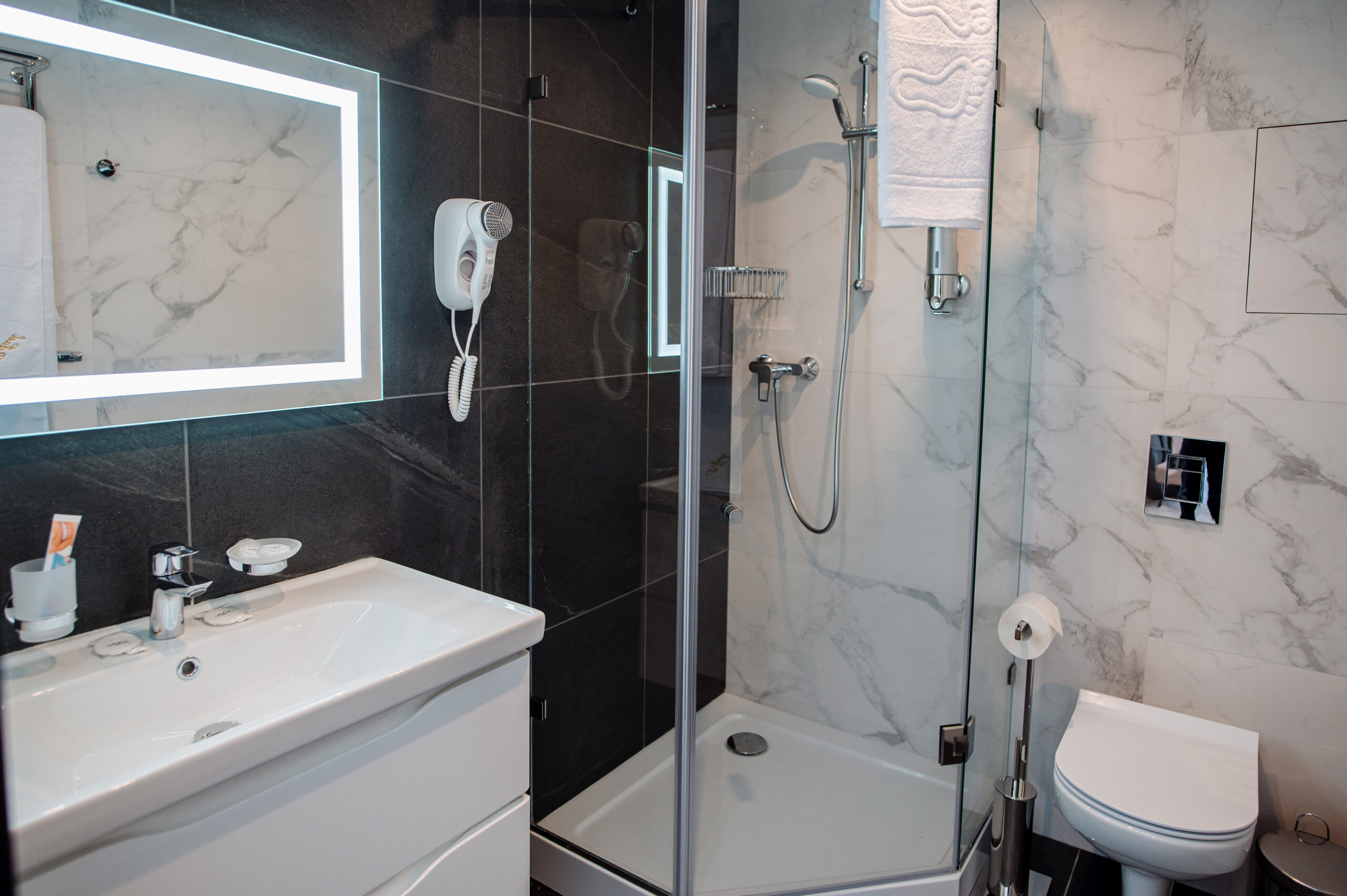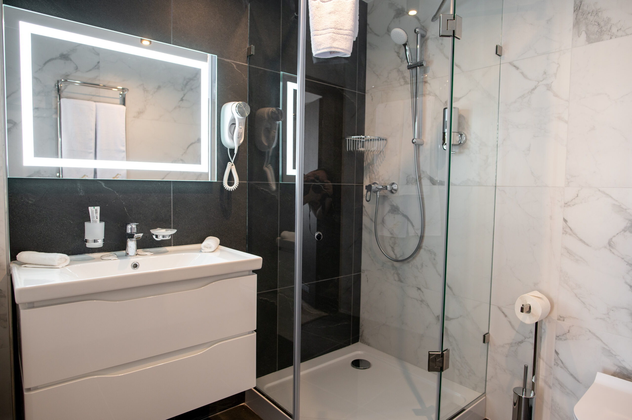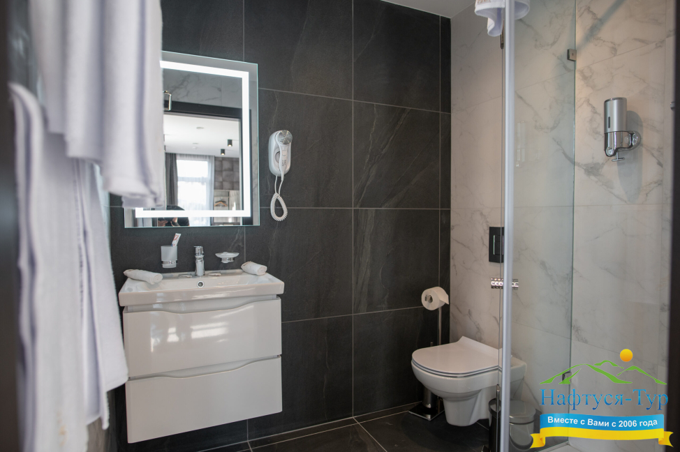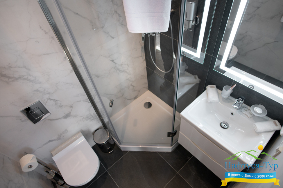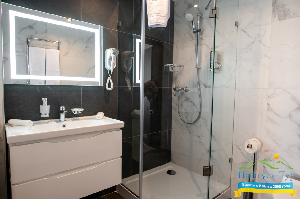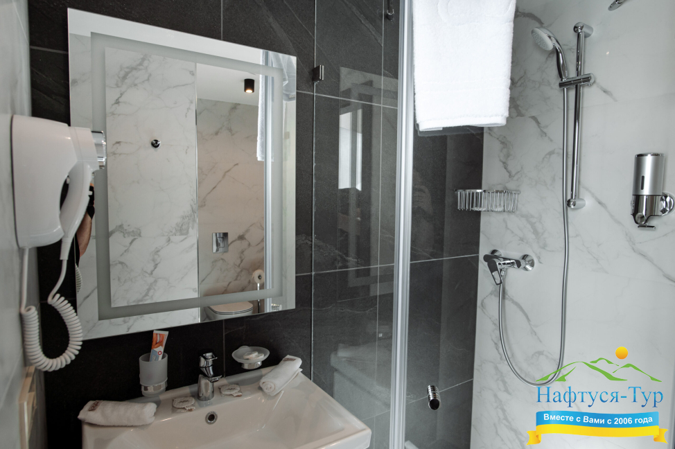 - душевая кабина, косметический набор, набор полотенец, фен