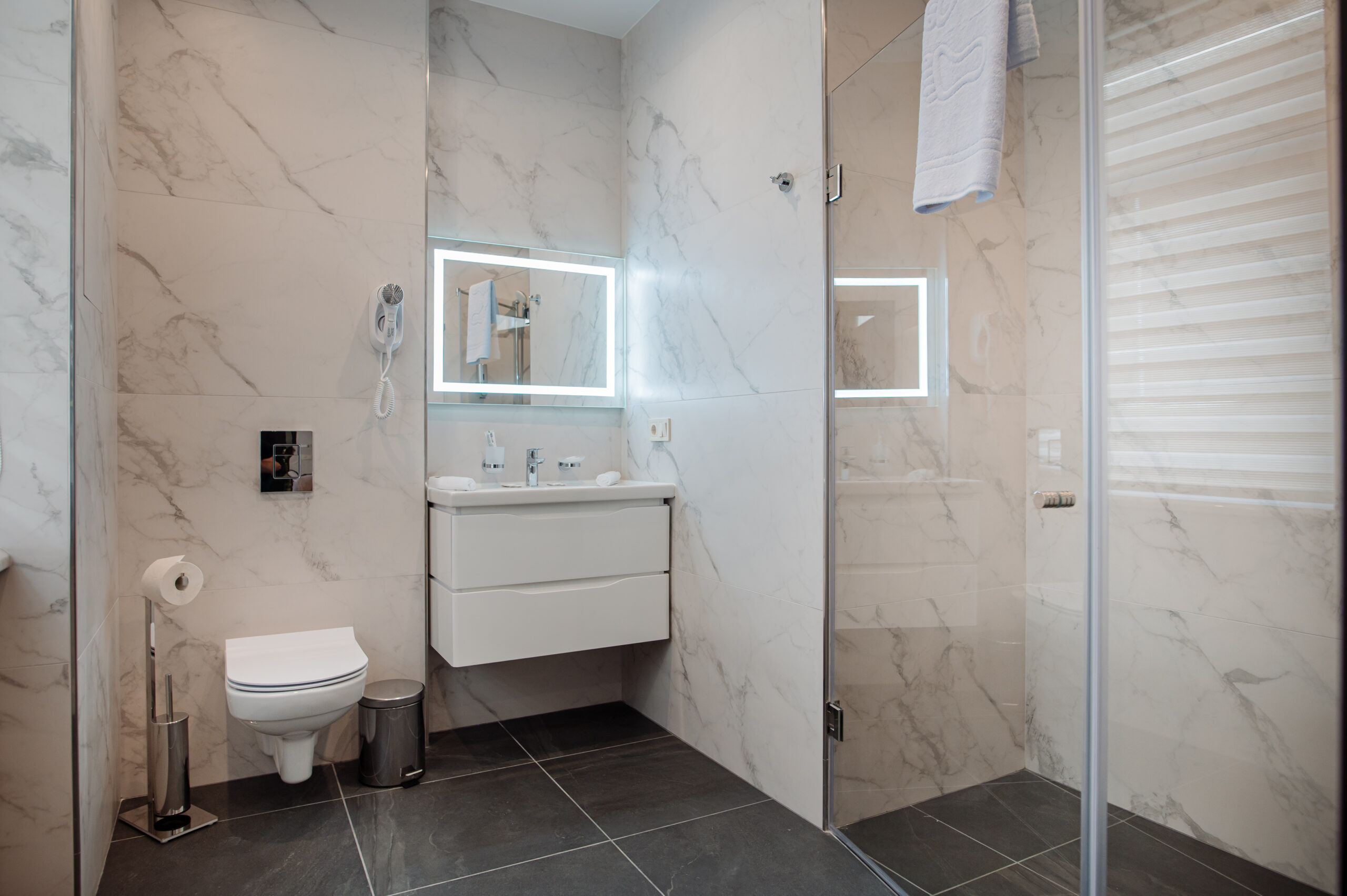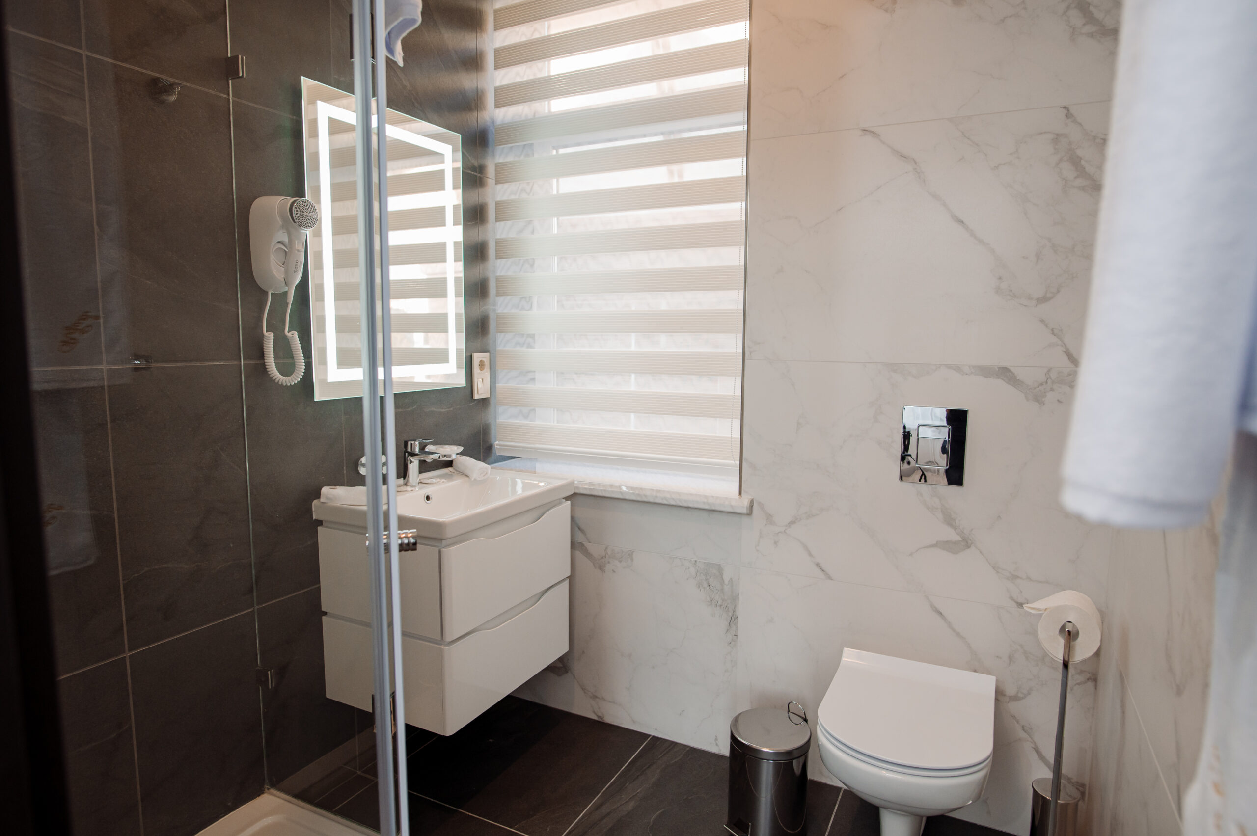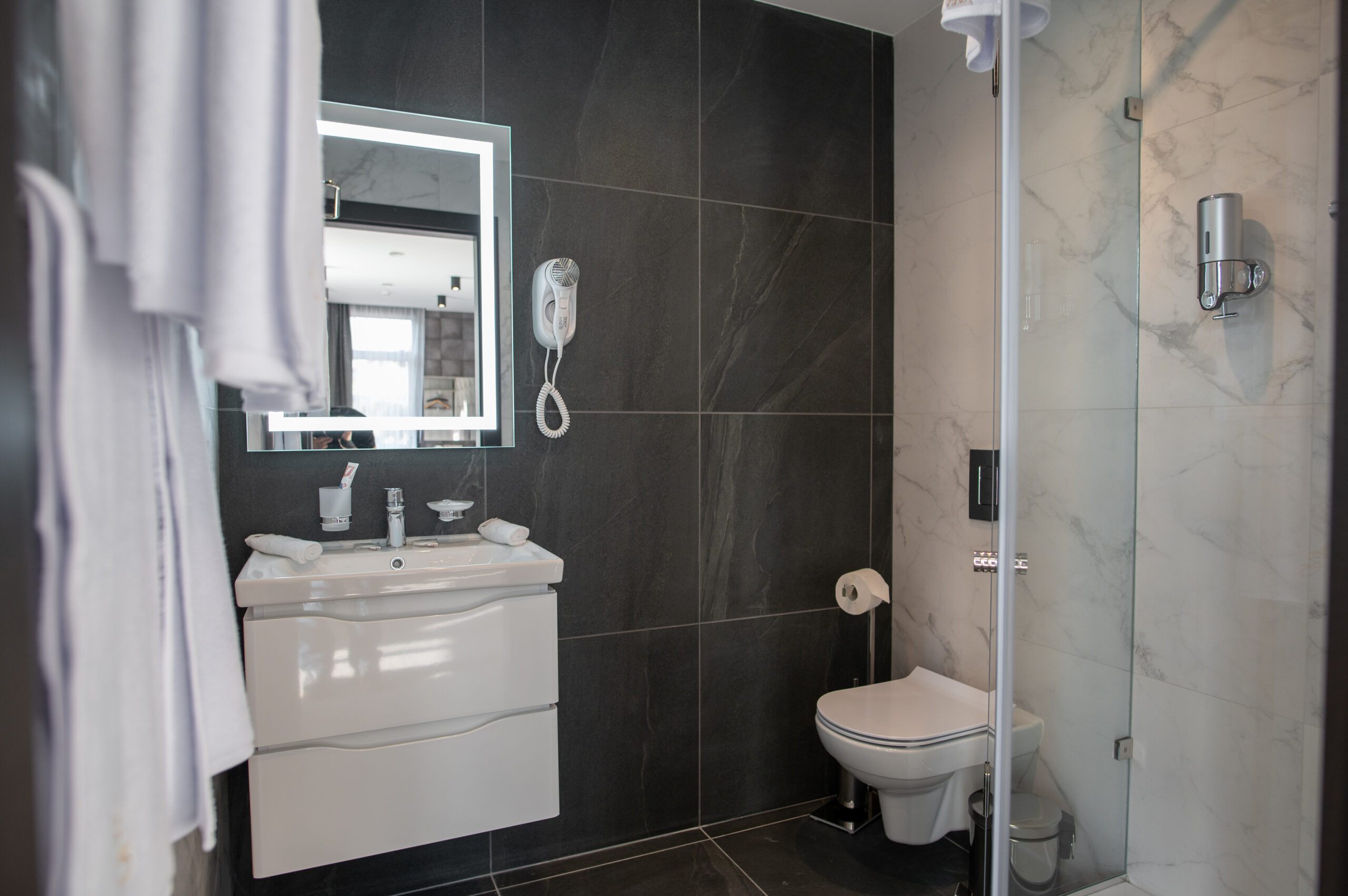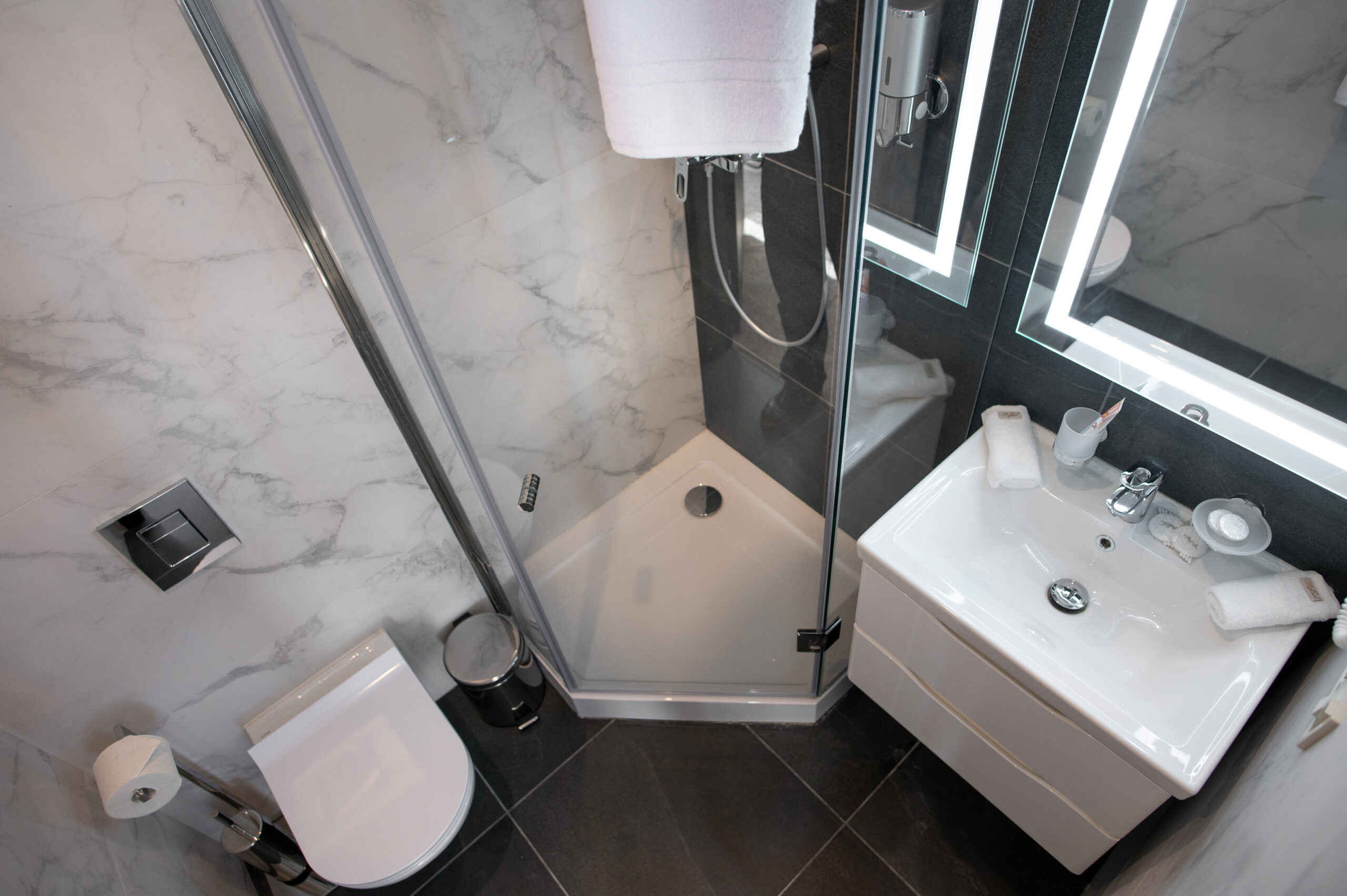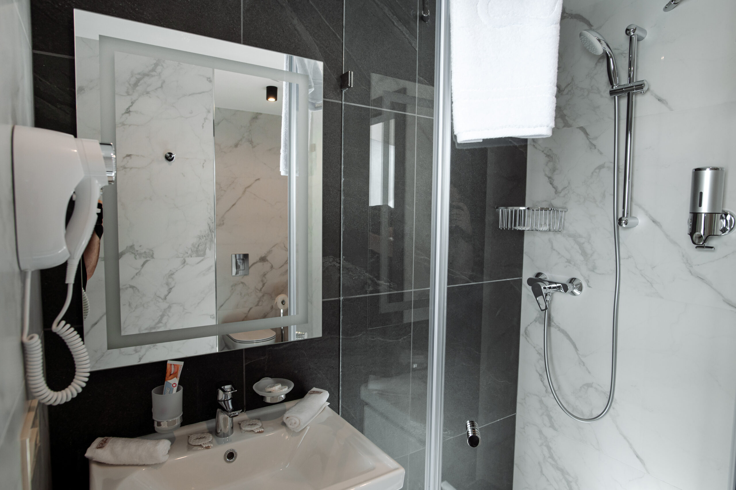 - душевая кабина, косметический набор, набор полотенец, фен