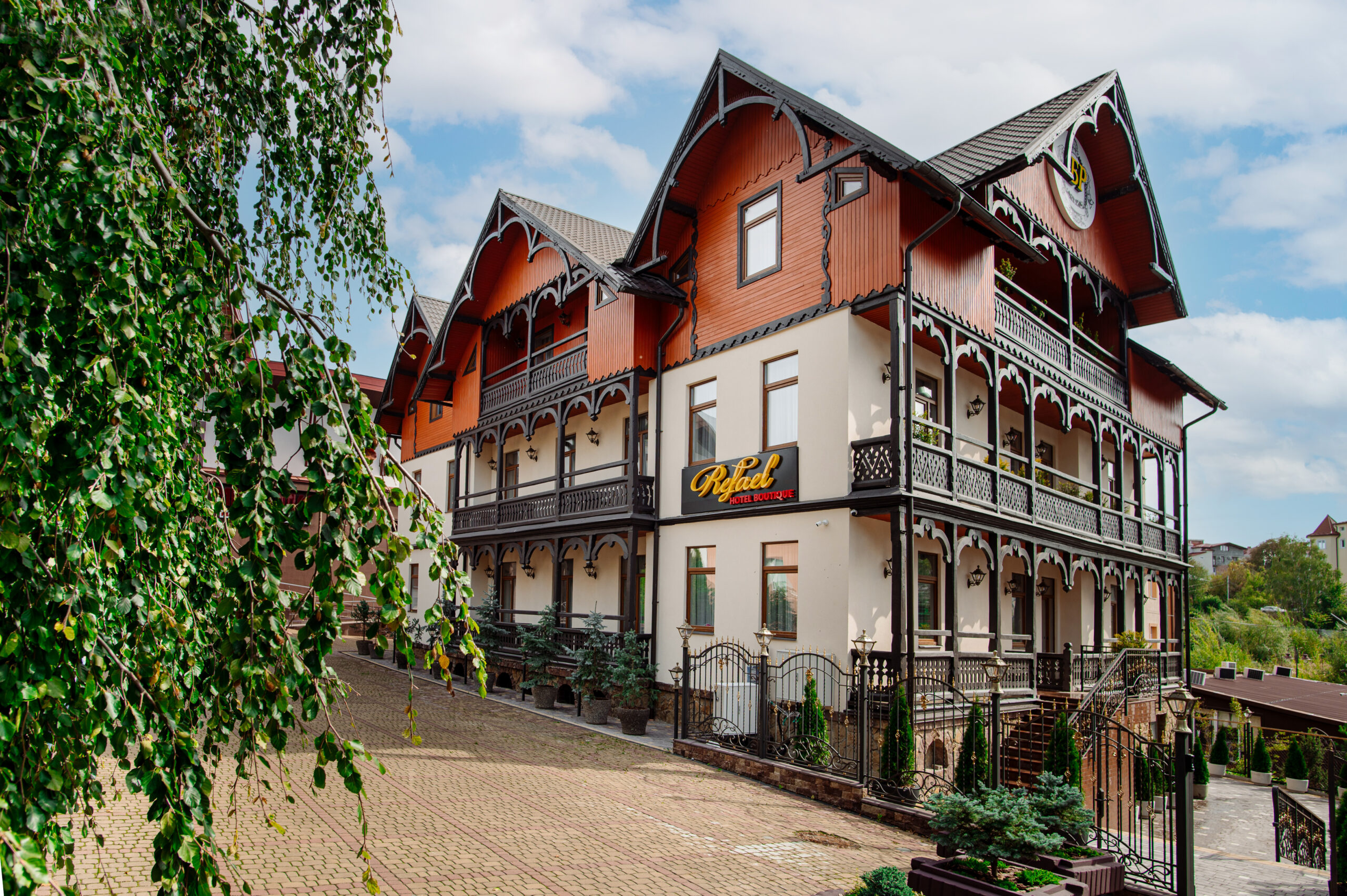 Отель «Рафаель» расположен в курортном городе Трускавец, который славится своими минеральными водами и здоровым климатом. Отель представляет собой красивое здание в стиле альпийской архитектуры, окруженное зелеными насаждениями и горными вершинами.