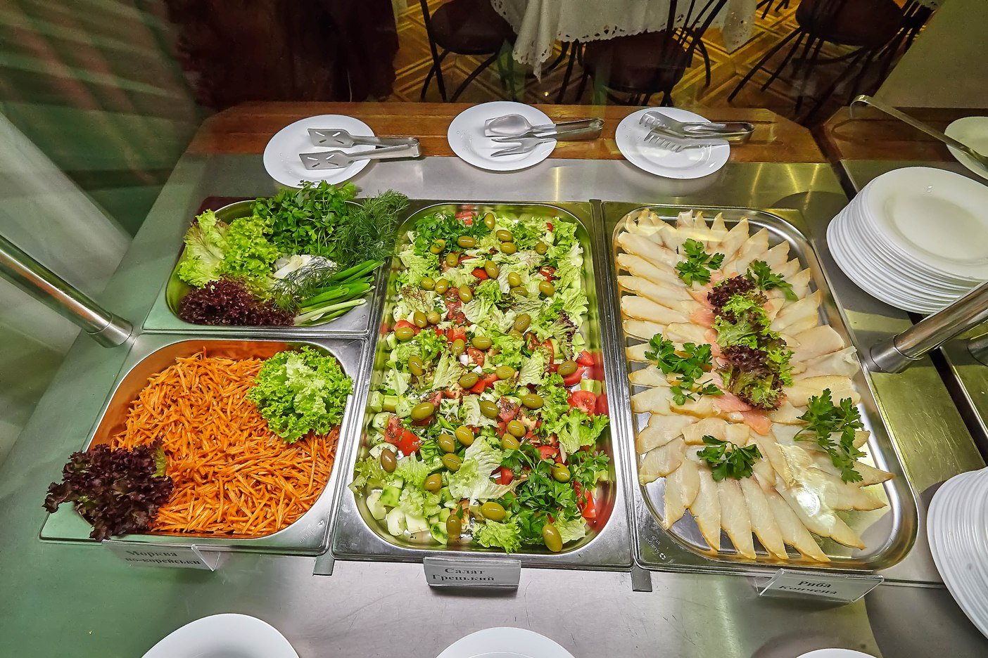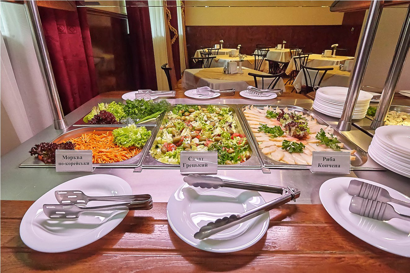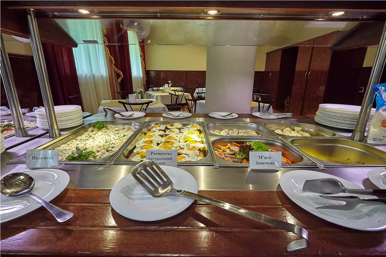 Санаторий «Днепр» предлагает трёхразовое питание, включающее блюда украинской и европейской кухни. Особое внимание уделяется диетотерапии: блюда готовятся с учётом лечебных рекомендаций врачей. Гости могут выбрать индивидуальное меню в зависимости от показаний и предпочтений.
