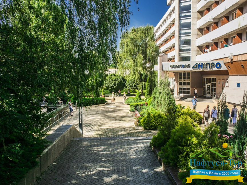 Санаторий «Днепр» находится вблизи бюветов минеральной воды, курортного парка и главных достопримечательностей города. Это позволяет гостям легко совмещать лечение и отдых.