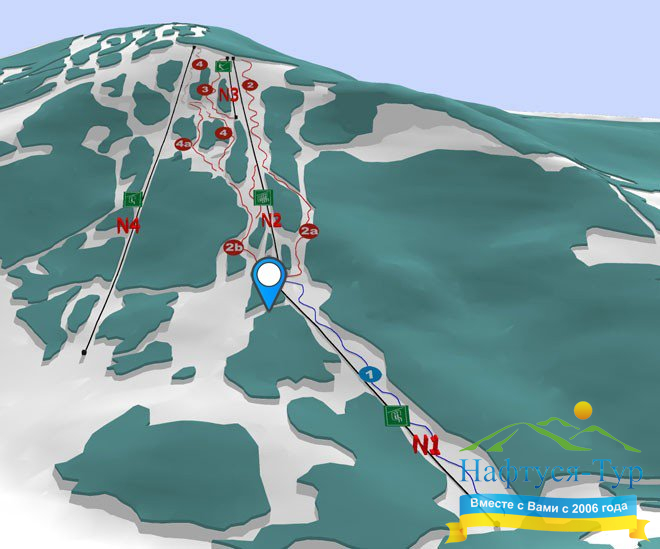 В конце села повернуть направо через железнодорожный переезд в направлении села Люта. Въехать в село Вышка и остановиться у подъемника.